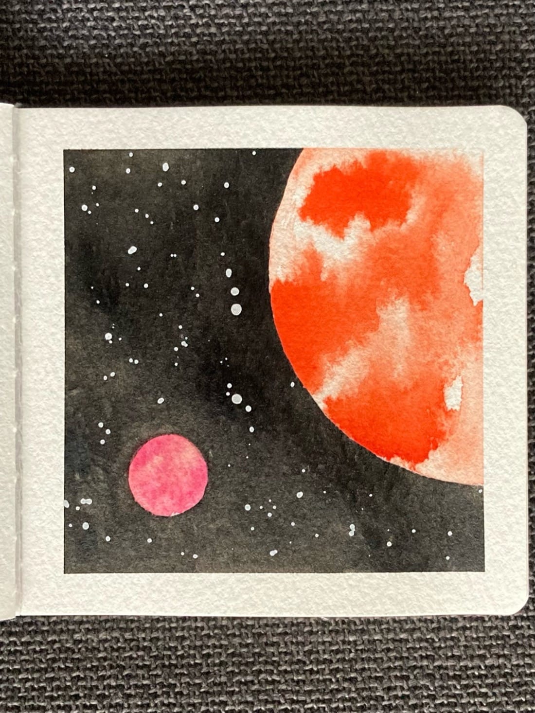 A watercolor painting of a planet and its moon in space. The white and red-orange planet is partially visible in the upper right section of the painting. In the bottom left is a small pink moon. Behind them is the darkness of space dotted with stars.