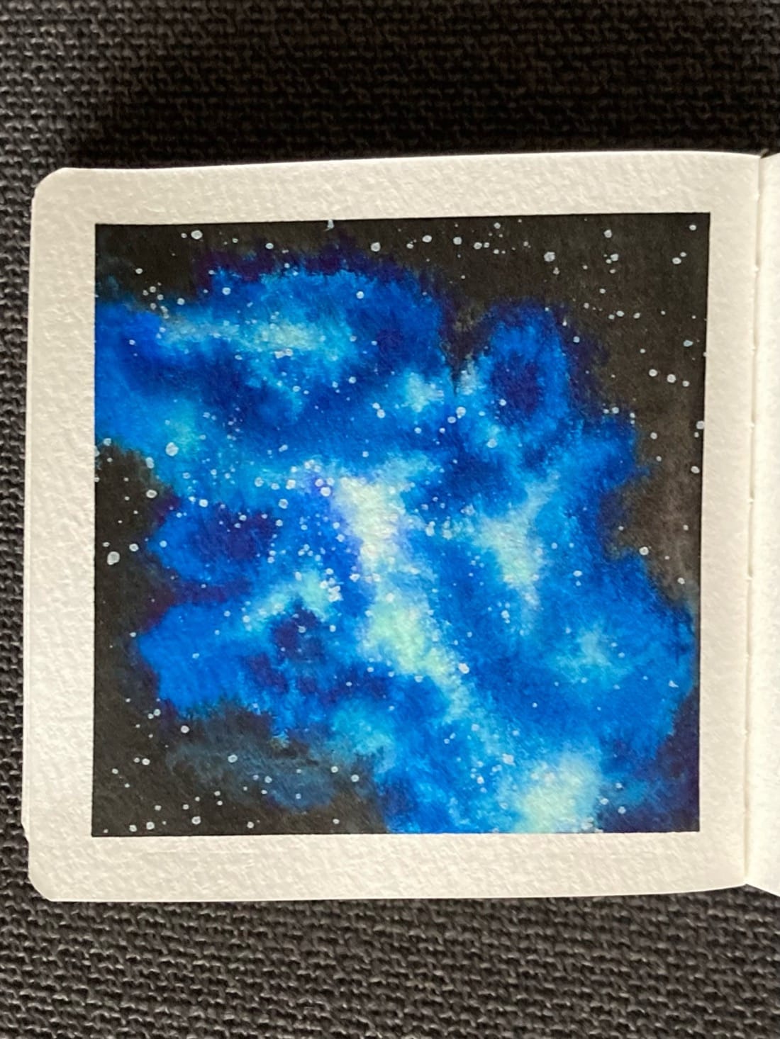 Nebula in Almost Night, Robin’s Egg (gouache), and Ultramarine. Background: Ivory Black Stars: White gouache