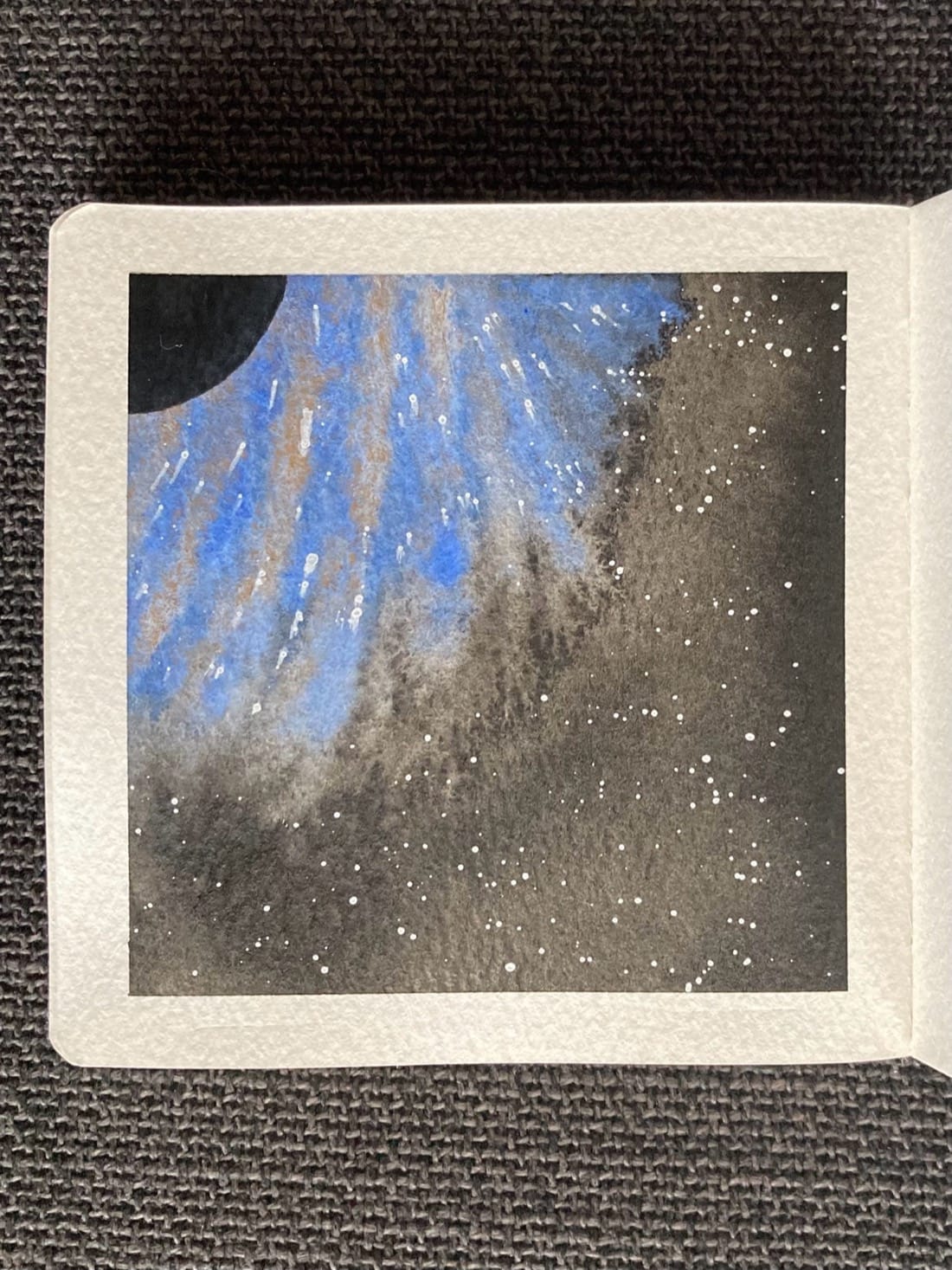 Black hole in Ultra Grey (gouache), Ultramarine, and Fairytale Gold. Black hole center: Ivory Black and Payne’s Grey Background: Ivory Black Stars: White gouache
