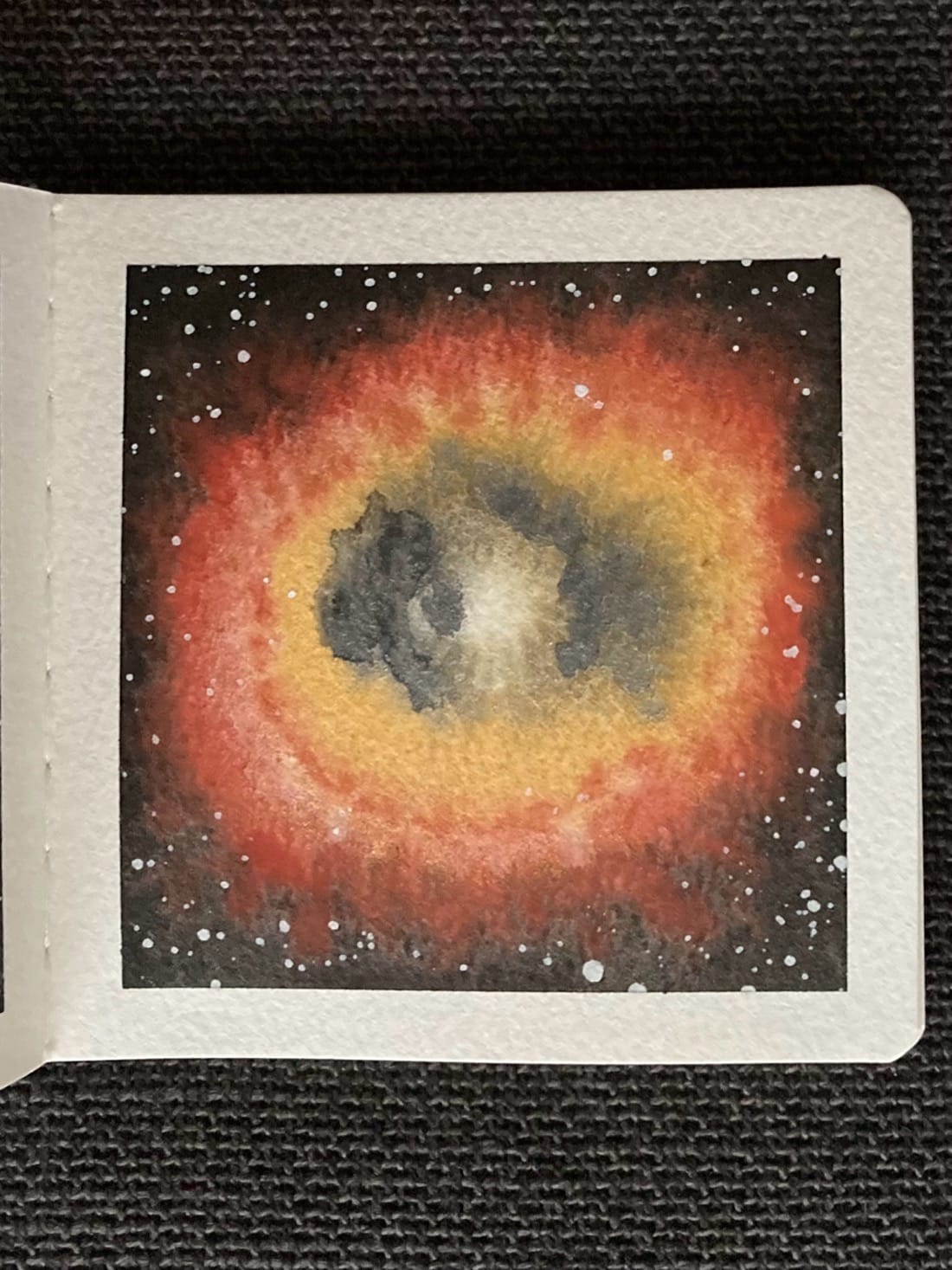 Supernova in Orca (mica), Wild Salmon (mica), Yellow Ochre, and Venetian Red. Background: Ivory Black Stars: White gouache