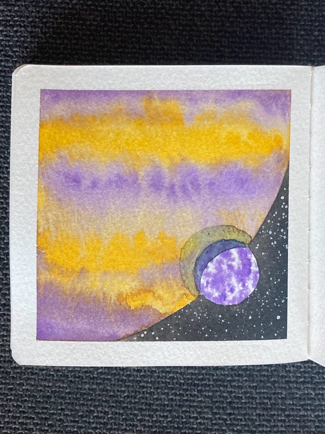A watercolor painting of a planet and its moon in space. Filling all but the lower right corner of the page is a purple and yellow striped gas giant. Its small white and purple speckled moon overlaps the edge of the planet, casting a shadow on its surface. Behind them is the darkness of space dotted with stars.