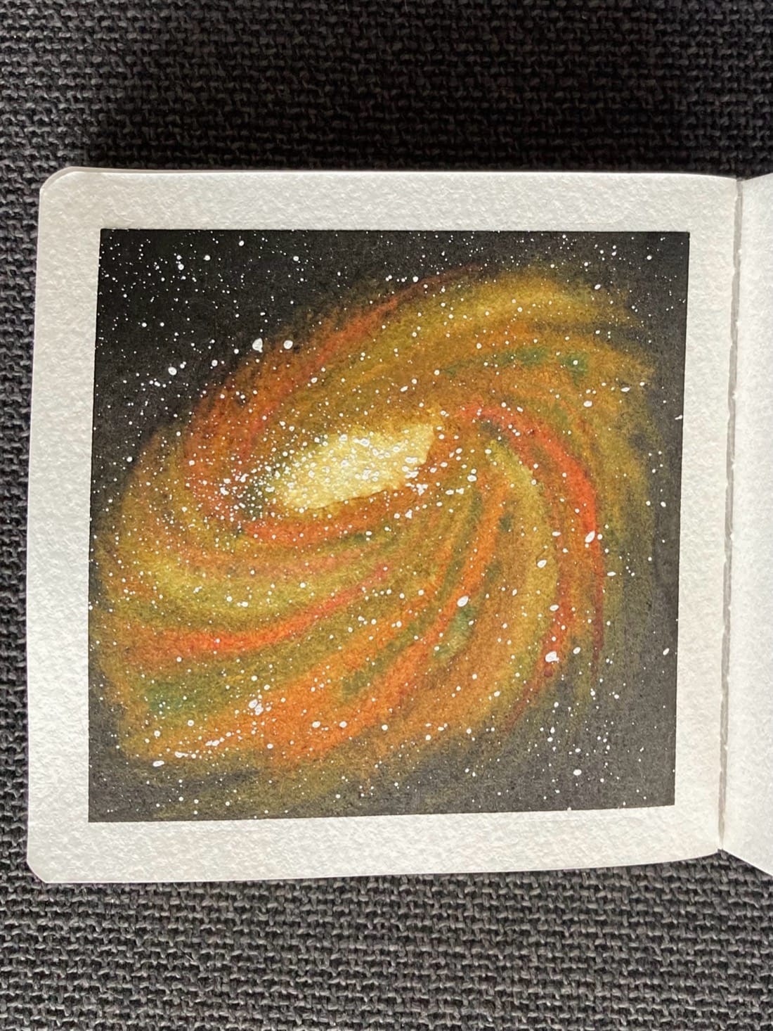 Spiral galaxy in Boreal, Rose Madder, and Transparent Gold Deep. Background: Ivory Black Stars: White gouache