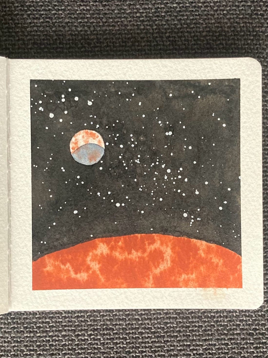 A watercolor painting of a planet and its moon in space. A thin sliver of the mottled red-orange planet is visible at the bottom of the page. In the top left of the painting hangs its white and orange dappled moon, partially in shadow. Behind them is the darkness of space dotted with stars.
