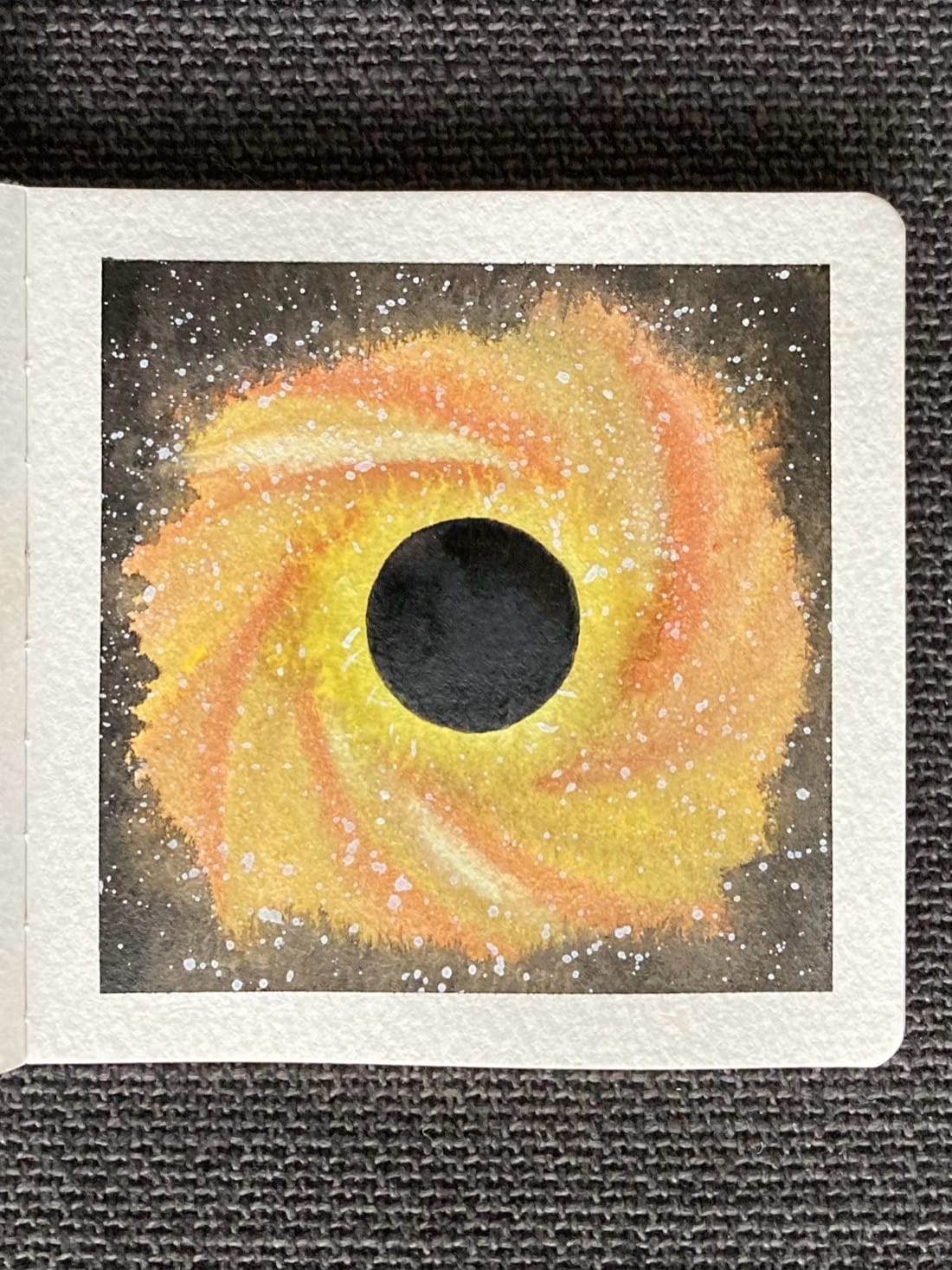 A watercolor painting of a black hole in space. Centered in the painting, the black hole’s centre is deep black, surrounded by a small halo of yellow gas. Around that are swirling red, orange and yellow gasses. Behind the black hole is the darkness of space dotted with stars.