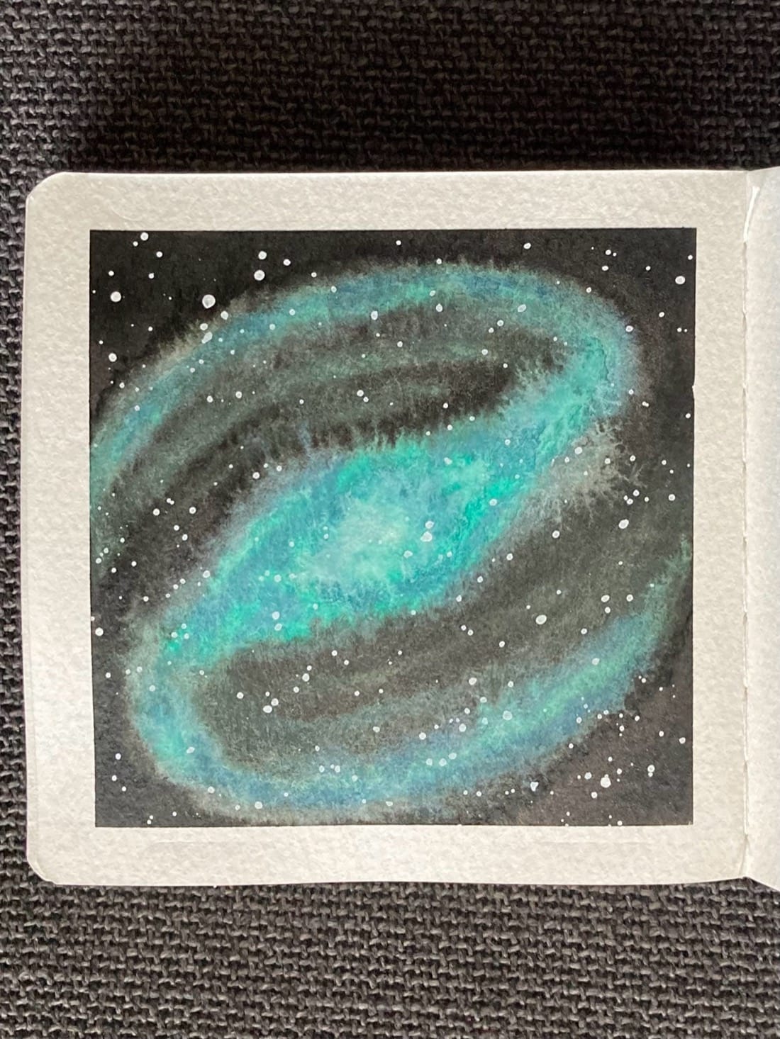 Barred spiral galaxy in Indigo and Lake Huron Teal Background: Ivory Black Stars: White gouache