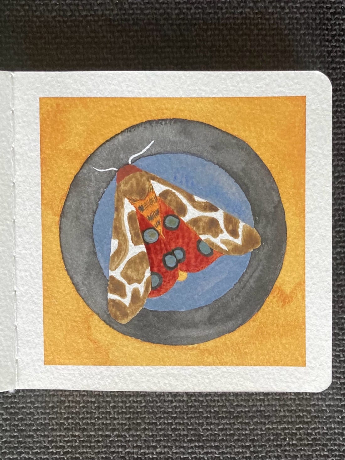A watercolor painting of a colourful moth. Its sitting within two concentric rings of blue-grey and deep grey. Its body is light orange with fuzzy dark grey bands. Its head is deep red. Its top wings are white with symmetrical medium brown blotches. Its bottom wings are deep red, each with three black spots with blue-grey centres. Its sitting within two concentric circles of blue-grey and deep grey that mimic the spots on its lower wings. Behind the circles is a vibrant golden-orange background.
