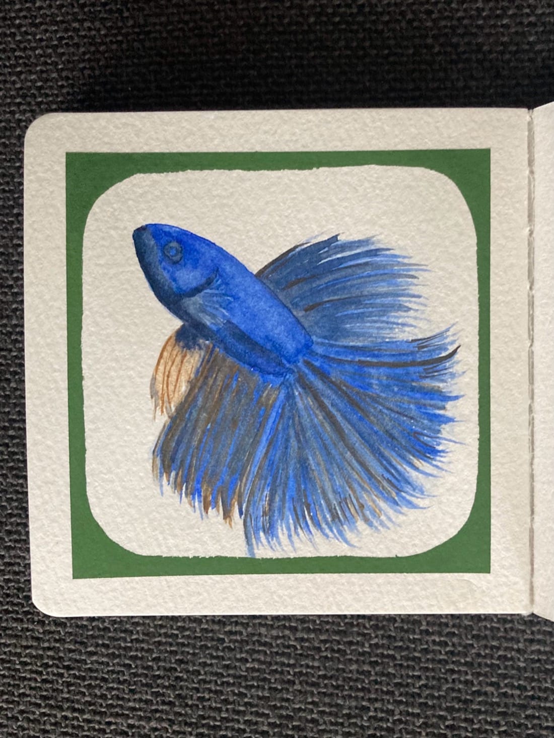 A watercolor painting of a beta fish. Its body is ultramarine blue. Its front-most bottom fin is light brown with blue and brown streaks. It’s large bottom and top fins, and its tail are ultramarine blue with dark grey and brown streaks. It is angled upward towards the top left corner. Around the edge of the painting is a forest green border with rounded inside edges.