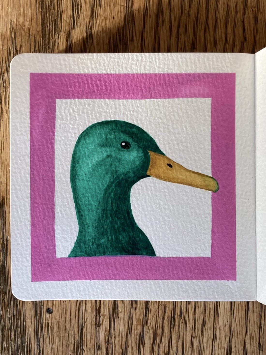 Say hello to Peaty, a green-headed duck! Paints: Beach Rose (gouache), Phthalo Green, Yellow Ochre