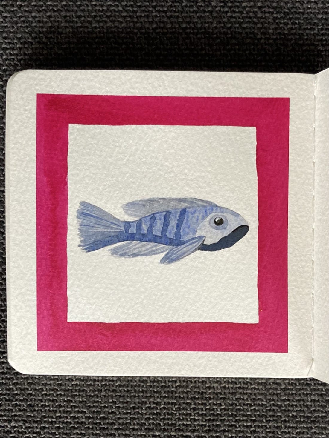 A watercolor portrait of a navy blue fish. It’s body medium blue with five thick vertical stripes of dark blue. Its head is pale blue, except for its lower jaw which is dark blue. It has a large black eye surrounded by a medium blue ring. Its fins are light blue, streaked with darker blues. Around it is a thick magenta border.