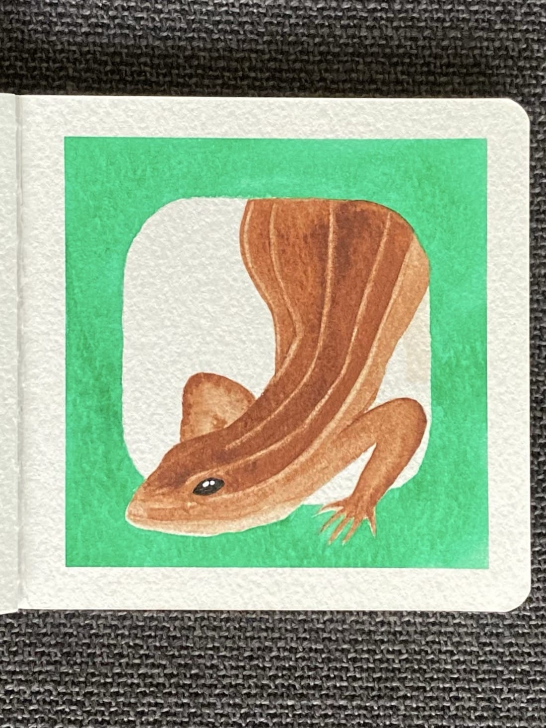 A watercolor painting of a striped brown lizard. Around the edge of the painting is a thick green border with rounded inside corners. The lizard is partially visible, entering from the top right corner of the area inside the border with its head and front foot overlapping the green border on the bottom edge. It’s body is brown, darker on top and lighter on the bottom, with five thin light stripes running from its head along the length of its body.
