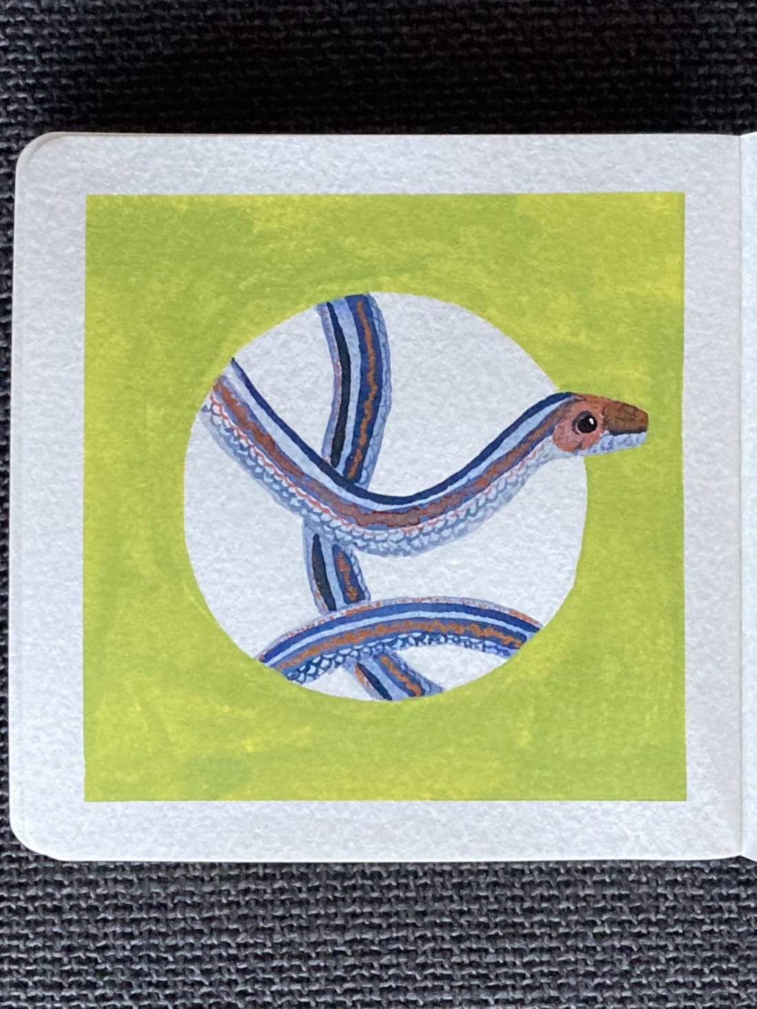 Say hello to Fran, a colourful garter snake! Paints: Milkweed (gouache), Timberwolf, Wild Salmon (mica)