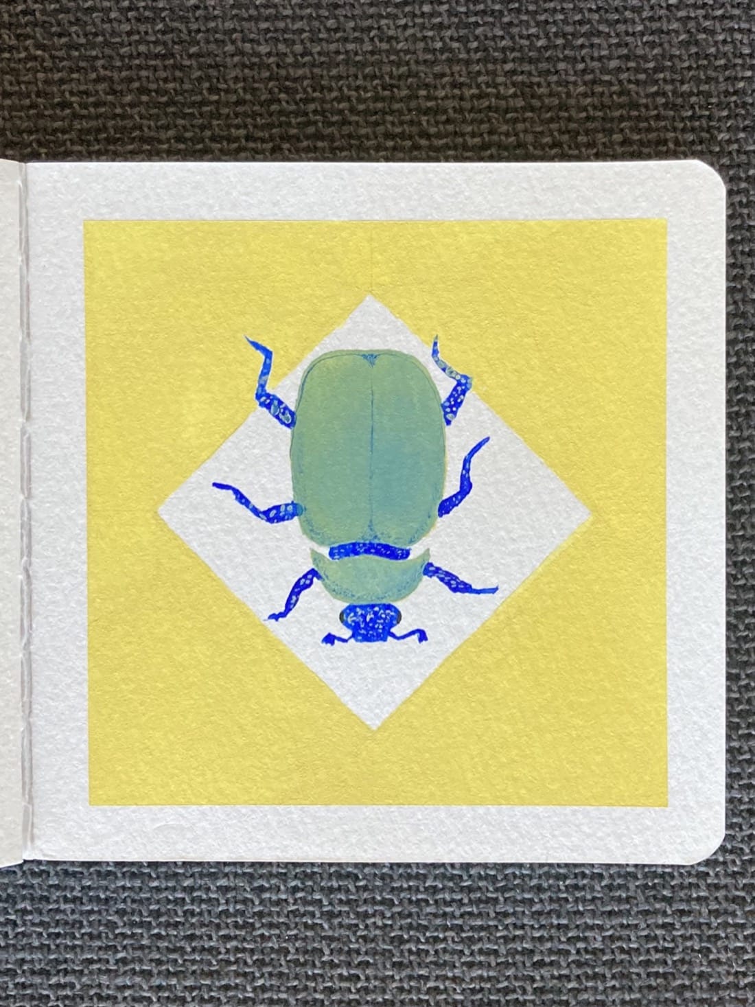 A watercolor painting of a teal green and cobalt blue beetle. The beetle’s shell is teal and its head and limbs are cobalt blue with yellow speckles. It’s facing downwards on the page in a white diamond on a yellow background. Its rear legs extend slightly past the diamond’s border.