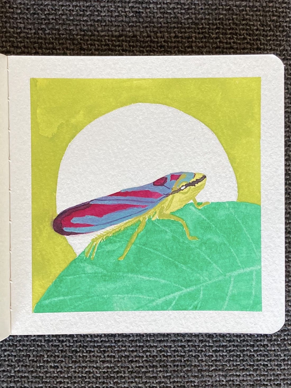A watercolor painting of a long, colourful bug walking along the edge of a large green leaf. The bug’s body and legs are bright yellow-green. It’s wings are red with pale blue stripes and a dark rear edge. Its face is bright yellow green. A dark horizontal stripe runs across its eye and face. Behind the bug and the leaf it’s walking on is a large white circle on a bright yellow-green background.