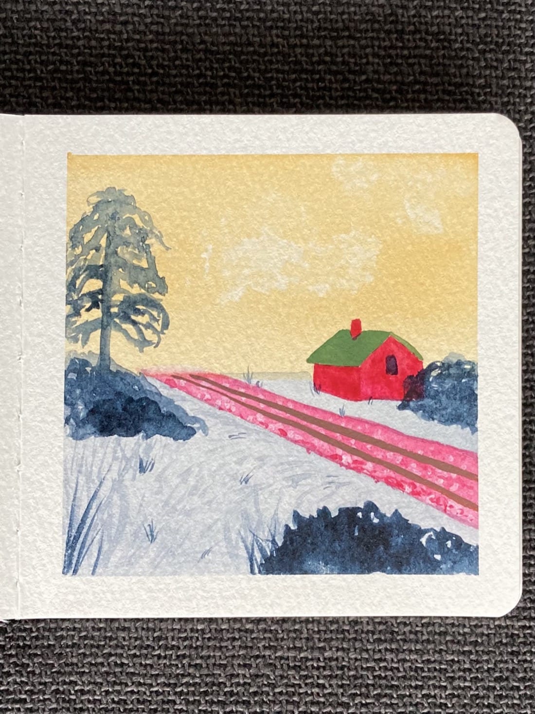 A watercolor landscape painting with unusual color choices. A small bright pink house with a deep green roof sits on the right side of a field of pale blue grass, which is cut through by train tracks running diagonally from the left over pink gravel. To the right is a small hill covered in deep blue bushes, and upon which grows a tall tree with many downturned branches. In the foreground are deep blue grasses to the left and a low deep blue bush to the right. Above the scene hangs a yellow sky with a few fluffy white clouds.
