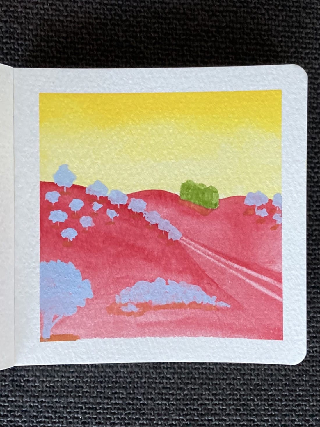 A watercolor landscape painting with unusual color choices. Red hills under a bright yellow sky are split by a dirt road. On the top of a hill on the right is a crumbling green stone building. The hills are peppered with pale blue-grey trees and bushes.
