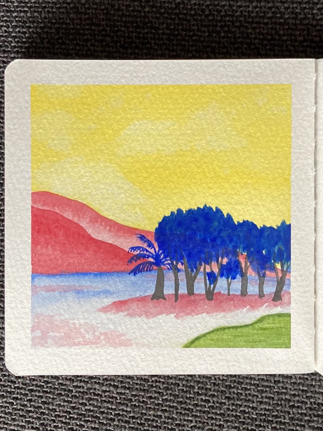 A watercolor landscape painting with unusual color choices. A copse of black trees with blue leaves stands on a red outcropping near a small green lake. On the right side of the group of trees is a single palm tree. Behind the trees is a blue plain with red sloping mountains in the distance. The sky is bright yellow with light yellow puffy clouds.