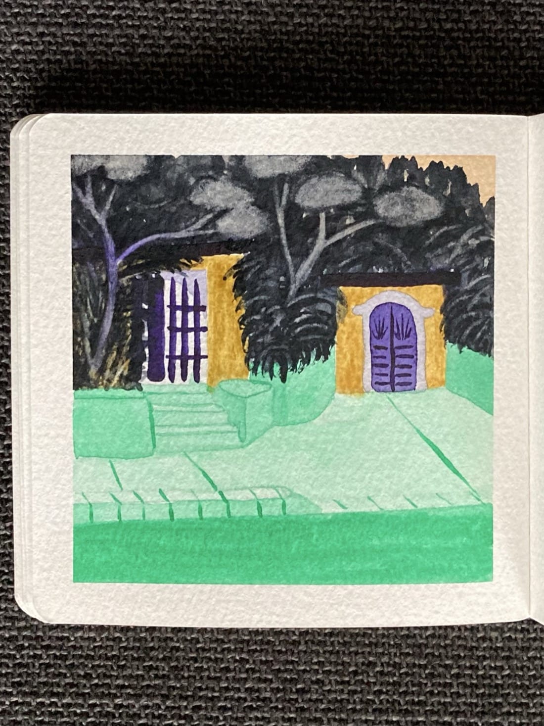 A watercolor landscape painting with unusual color choices. A yellow building is surrounded by deep black foliage. Its entrance is a dark purple gate at the top of a few pale green concrete steps. To the right is another yellow building at street level. It has a carved dark purple door with decorative light purple trim. It, too, is surrounded by deep black foliage. In front of the building is a pale green sidewalk and a saturated green asphalt road.