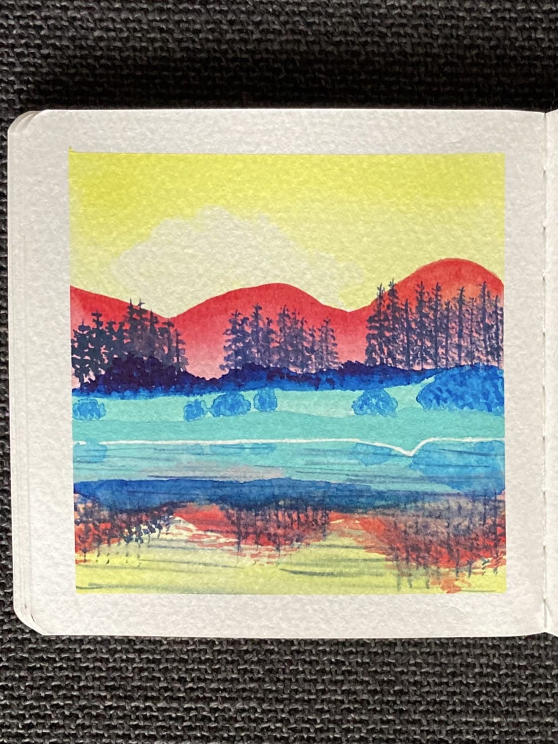 A watercolor landscape painting with unusual color choices. A pale blue riverbank is studded with medium blue bushes. Behind them are darker blue bushes and stands of pine trees. In the distance are rolling red mountains under a bright yellow sky. The scene is reflected in the river.