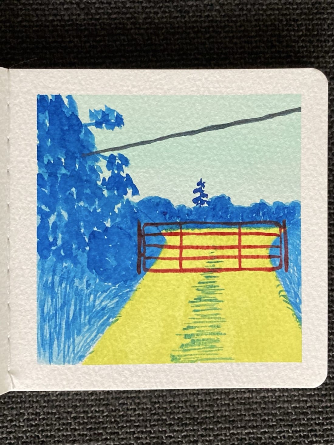 A watercolor landscape painting with unusual color choices. A red metal gate spans a bright yellow dirt road. On either side of the road are vibrant blue hills covered in grasses & bushes. To the left is a tall leafy blue tree. A shimmering telephone wire stretches from the tree across the pale green sky to the right. At the end of the road is cross road with blue bushes running along its sides. A solitary pine tree stands behind the bushes.