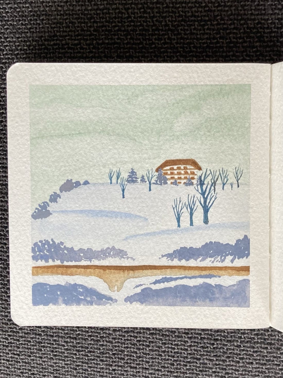 A watercolor landscape painting with unusual color choices. A four storey building sits atop a pale blue hill. Around it are blue-grey pine trees and leafless trees. Down the sides and at the bottom of the hill are blue grey bushes. A brown cement highway runs across the bottom of the hill. Above the scene is cloudy pale green sky.