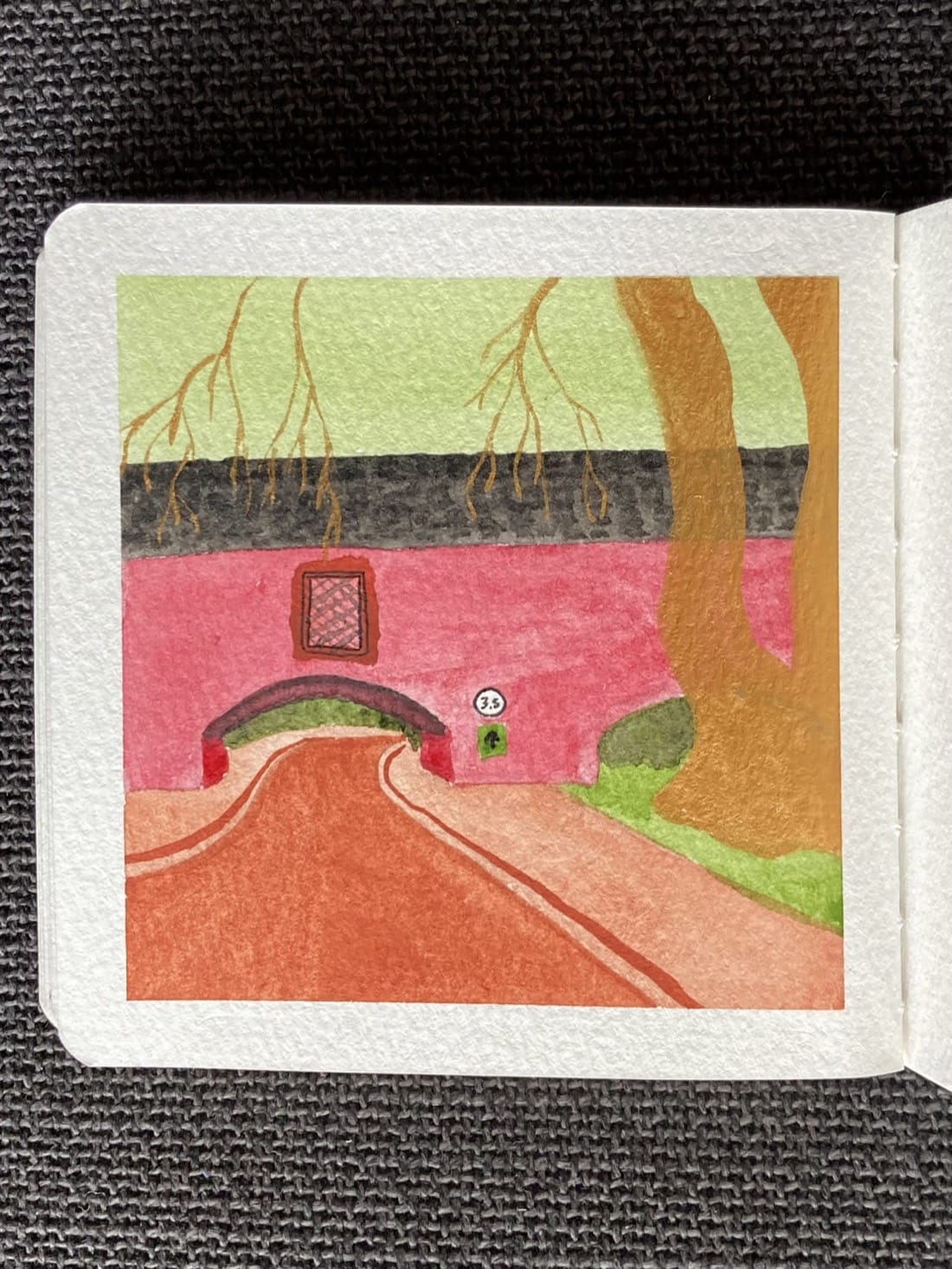 A watercolor landscape painting with unusual color choices. A dark orange road runs under an archway in a pink wall. On either side of the road is a pale orange sidewalk. The pink wall is topped by a black roof. To the right of the road is a very large golden tree with two main trunks that extend past the top of the painting. Their leafless branches hang down over the roof’s black wall.