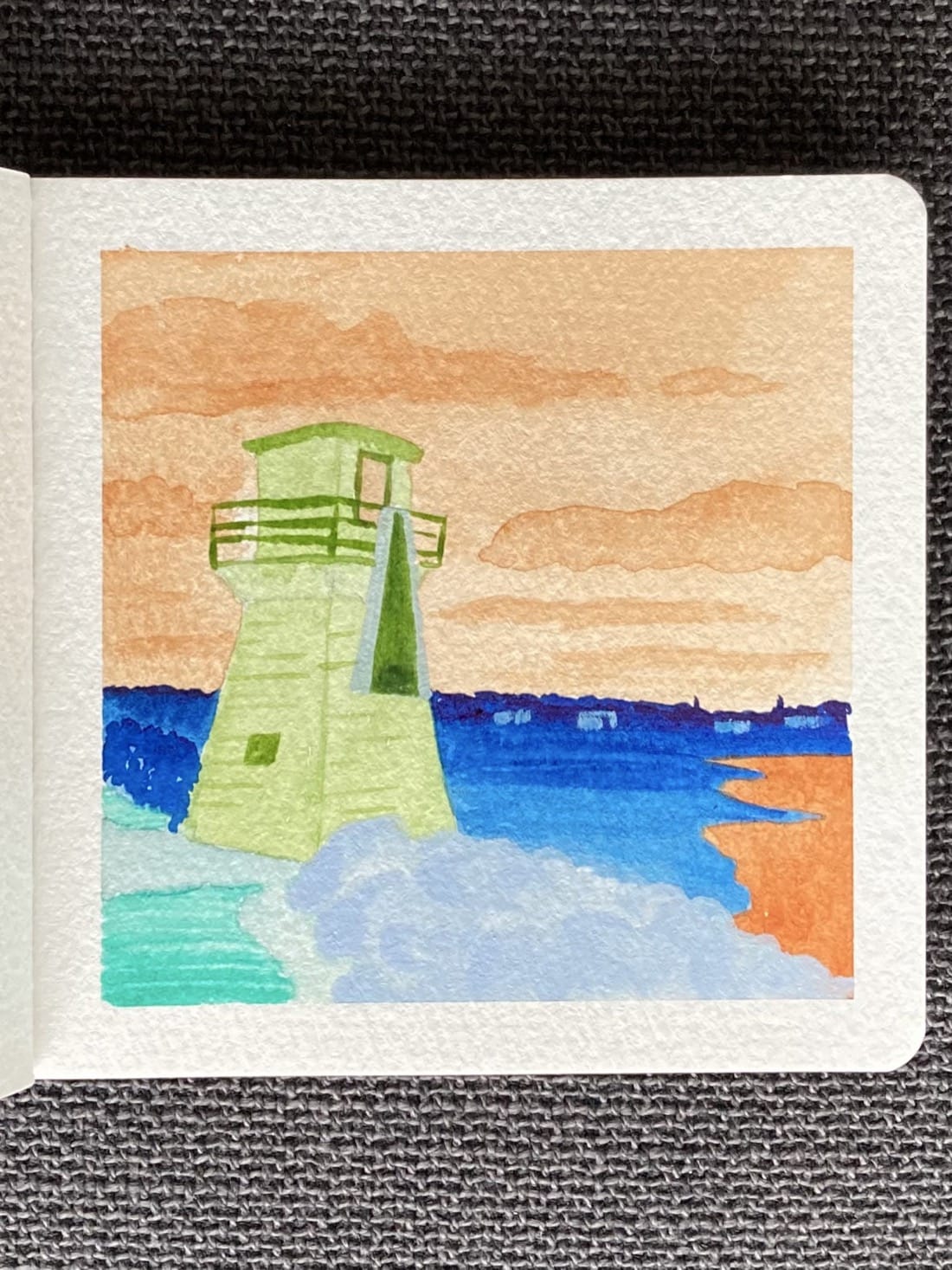 A watercolour landscape painting with unusual colour choices. A pale green lighthouse stands on a blue hill next to the orange ocean. In front of it is a pile of grey stones and a teal boardwalk leading to the lighthouse. In the distance are dark blue trees and a smattering of houses. Above, the sky is pale orange with bands of darker orange clouds.