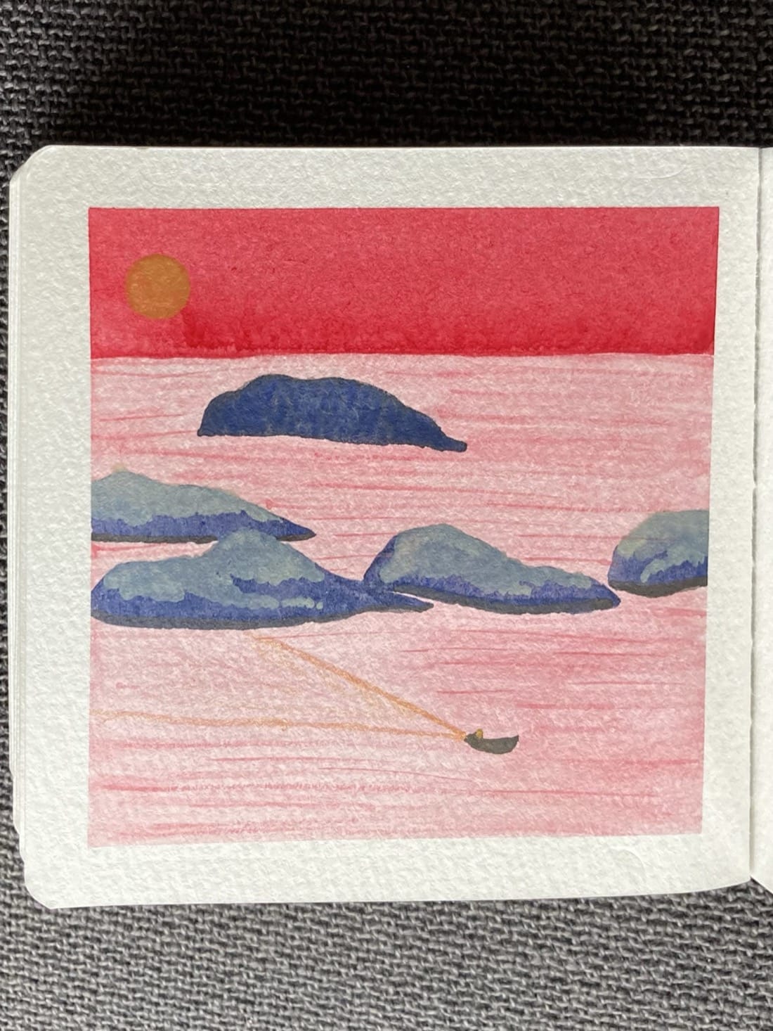 A watercolour landscape painting with unusual colour choices. A deep grey boat sails diagonally away from a group of mottled blue islands, leaving a golden wake in the pink ocean. The tops of the islands are covered in grey foliage. Above, the sky is bright red. The golden sun hangs low in the sky near the left edge of the painting.