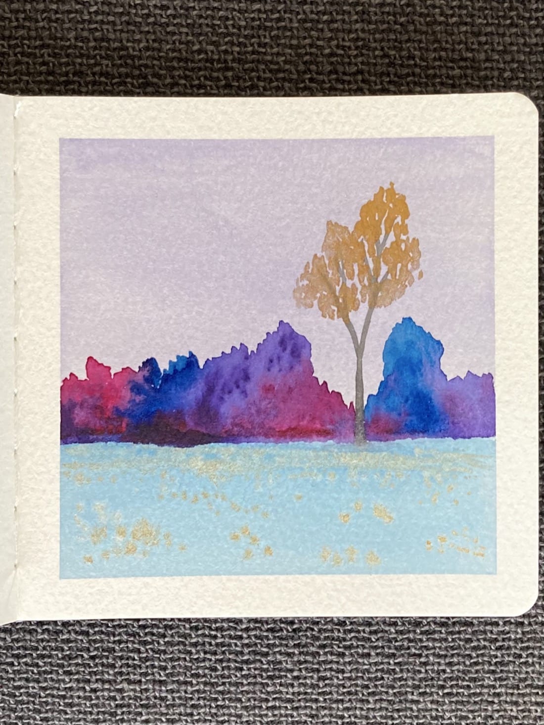 A watercolour landscape painting with unusual colour choices. In pale blue field dotted with gold daisies stands a sparkling grey tree with golden leaves. Behind it is a jumble of magenta, blue, and purple bushes and trees. Above, the sky is a pale lilac purple.