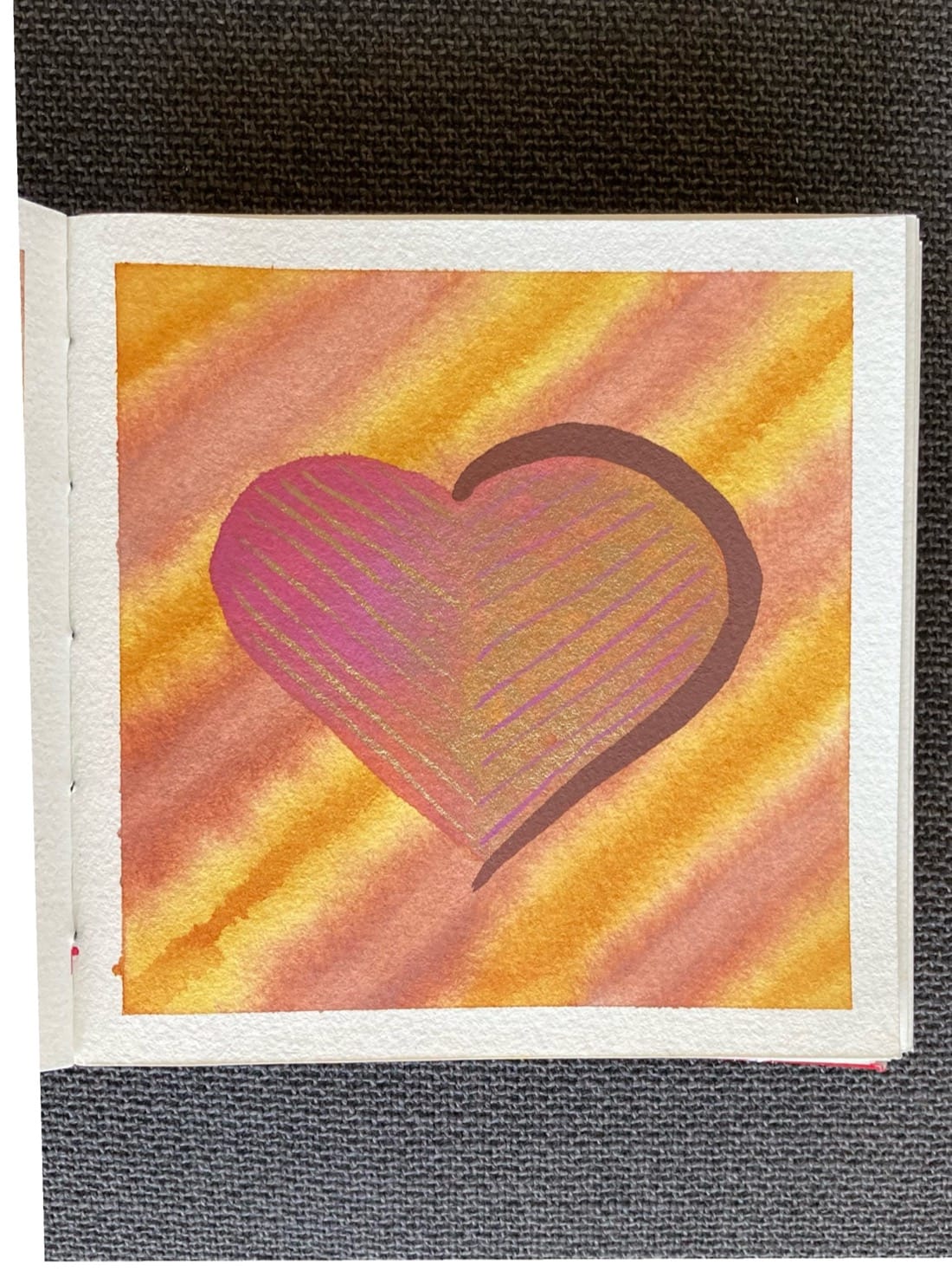 An abstract watercolour painting. A large heart sits on fuzzy, diagonally striped background. The background stripes are gold and mauve, their borders fuzzy and blending into one another. The left side of the heart is pink with rose gold stripes, the right side is rose gold with pink stripes. Along the right half of the heart is a thick deep burgundy stripe that tapers at each end.