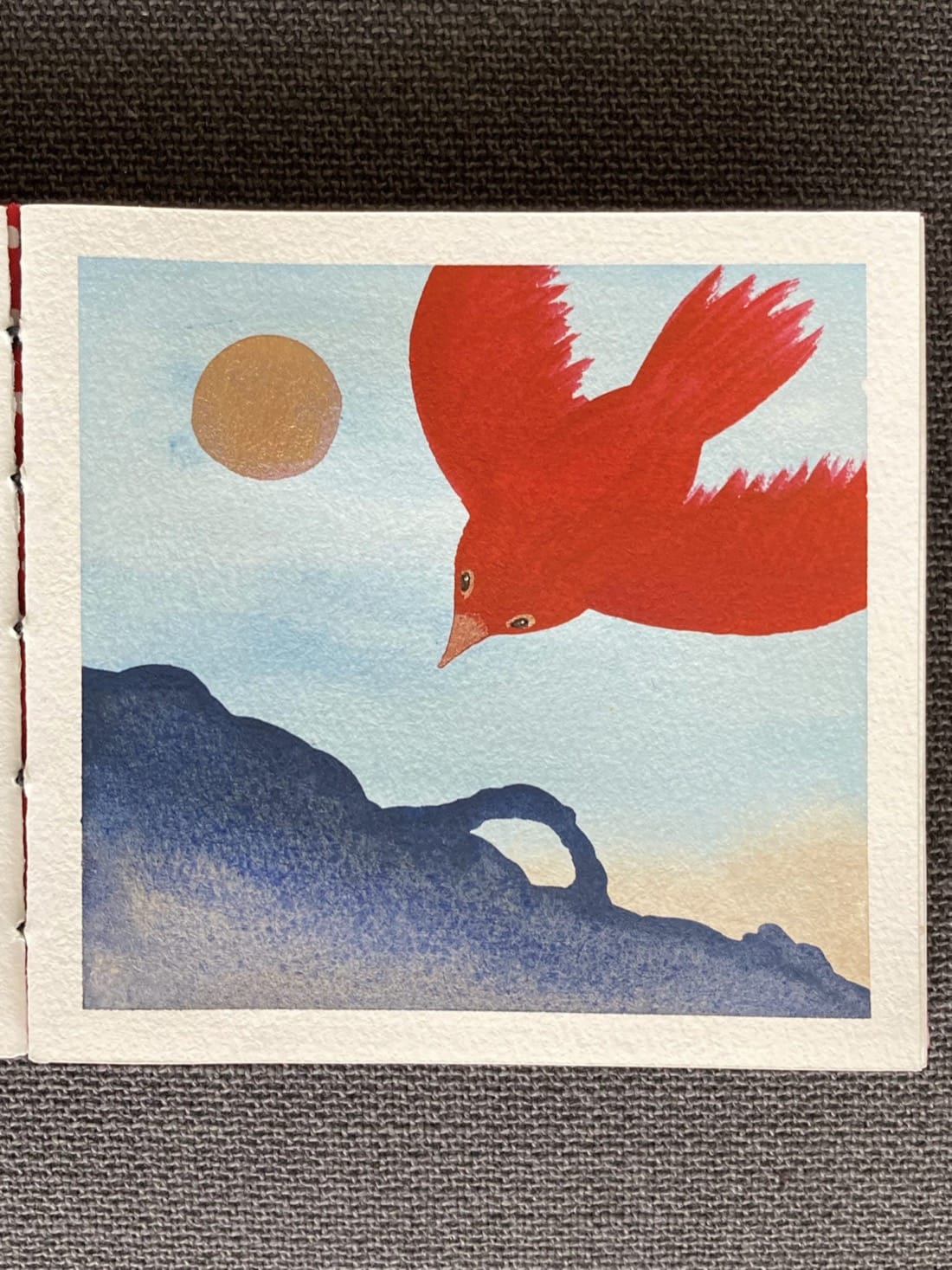 An abstract watercolour painting. A textured navy blue hill with a stone arch occupies the bottom left corner of the painting. In the top right corner, a giant red bird descends, its wings curving back, its golden beak pointed at the hill. To its left is a rose gold orb hanging in the pale blue sky.