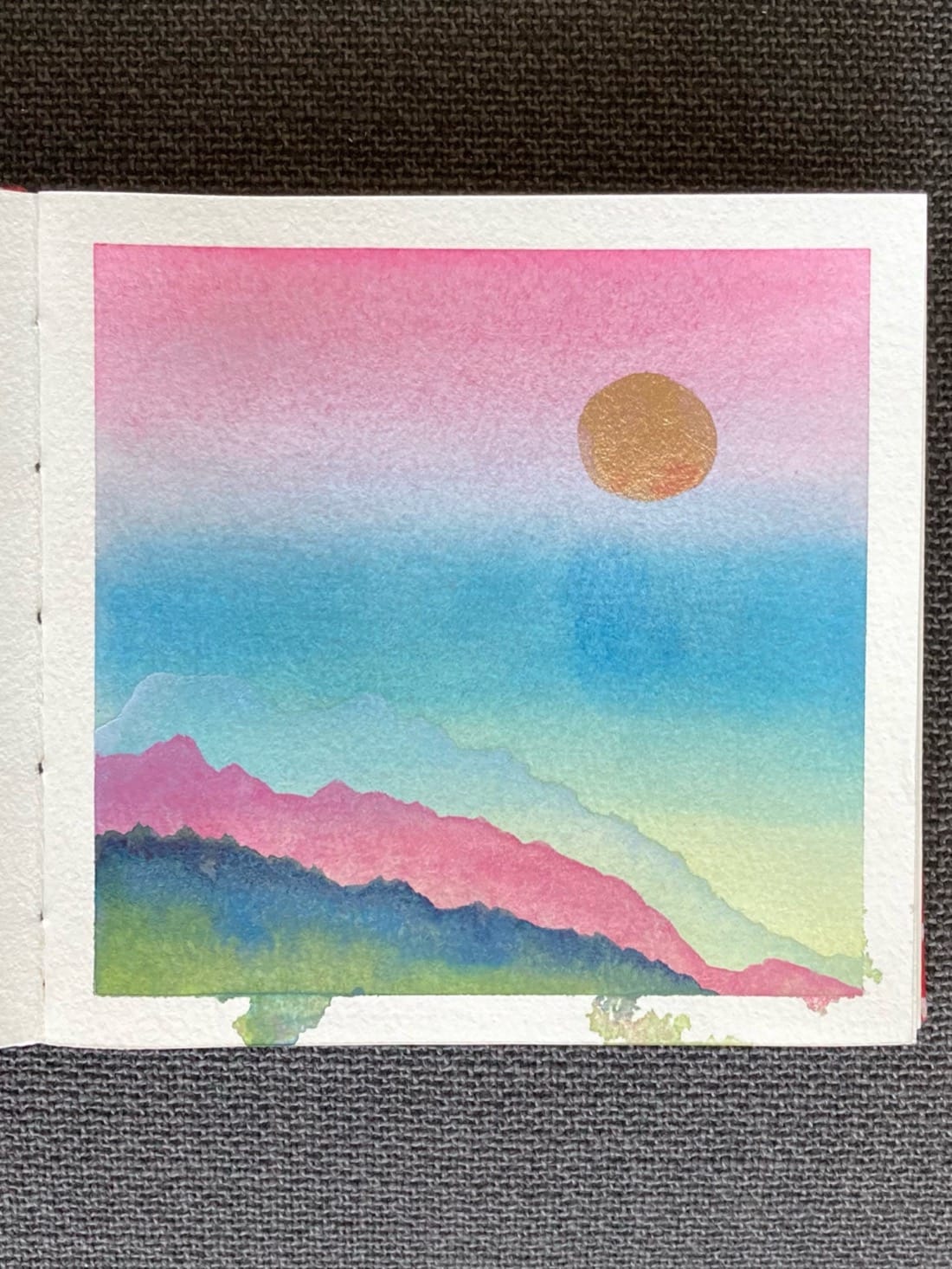 An abstract watercolour painting. A rose gold orb hangs in the sky above three mountain ranges. The furthest mountains are transparent pale blue, the middle mountains are pink, and the mountains in the foreground are deep sparkling blue with green foliage. The sky is a multicoloured gradient from bright pink, to blue, to pale green. At the bottom of the painting the paint has bled into the white border in a few places where the masking tape failed to adhere.