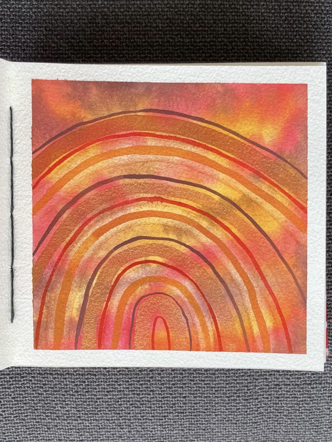 An abstract watercolour painting. Against a vibrant tie-dye background of yellow, pink, and deep reddish purple are four nested sets of arches. The arches are thin deep reddish purple, wide sparkling red-orange, medium orange, and thin bright red-pink. Behind the orange strip, the tie-dye background has been lifted slightly, giving it a bright halo effect.