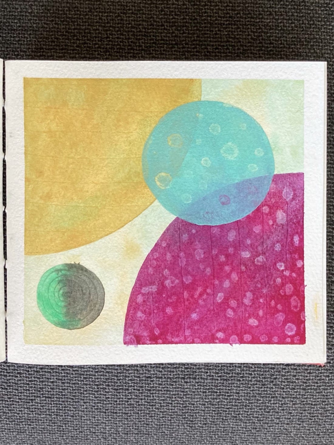 An abstract watercolour painting. A quarter of a large yellow circle takes up the top left corner of the painting. It has thin horizontal stripes in a slightly darker shade of yellow. The circle is slightly transparent and the mottled background is faintly visible through it. In the bottom right corner is a quarter of a large magenta circle. It has vertical stripes and is covered with pale blotches. Overlapping the two large quarter circles is a smaller robin’s egg blue circle covered in transparent spots reminiscent of moon craters. In the lower left corner is a small black and green circle with thin concentric circles marked into it’s surface like a bullseye.