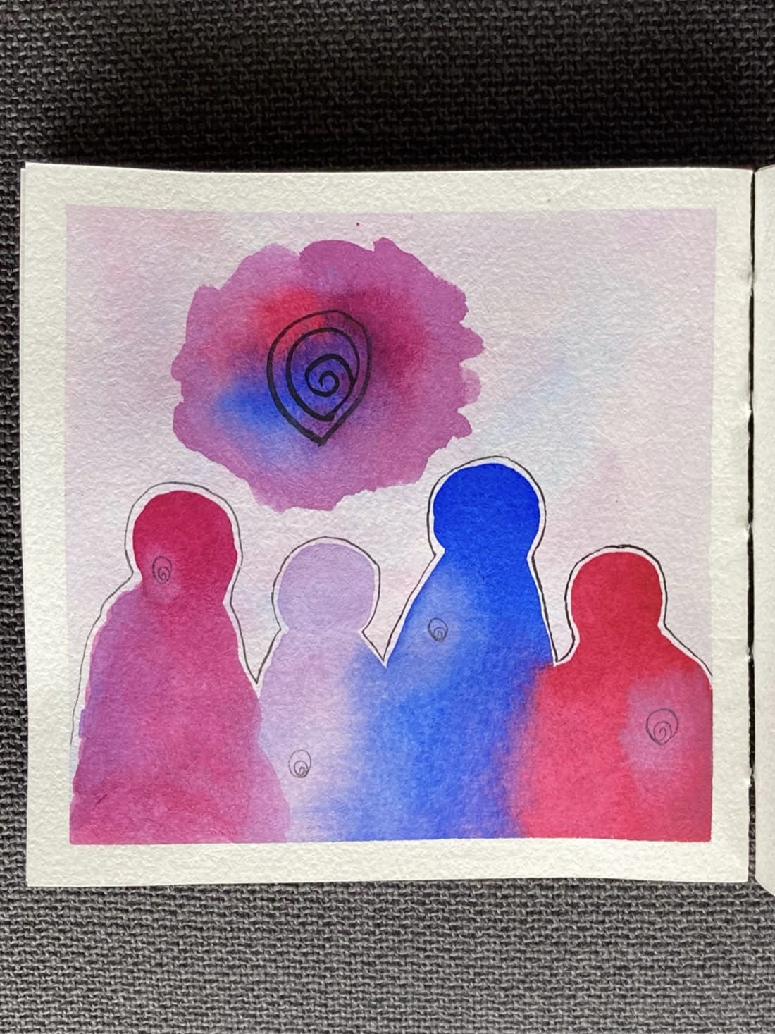 An abstract watercolour painting. Four blobby people in magenta, lilac, cobalt blue stare up at a blob in the mottled lilac sky. In each of them is a pointed spiral, mirroring the pointed spiral within the blob. A thin black line traces outside the outline of the people blobs, separating them from the sky blob.