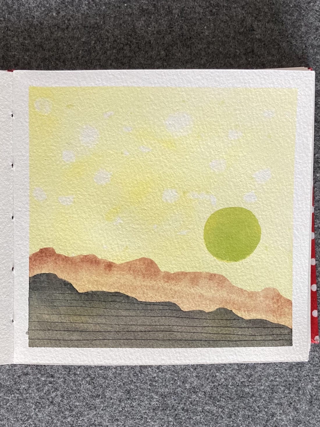 An abstract watercolour painting. In the foreground are two mountain ranges, brown mountains in the back and grey in the front. The grey mountains have thin horizontal dark grey stripes. Above them is a mossy green sun in a yellow sky full of tiny, blobby white patches.
