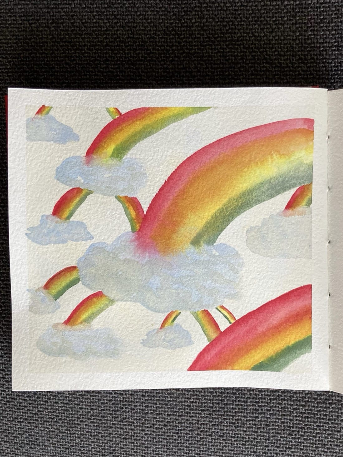 An abstract watercolour painting. A grey sky full of puffy clouds of different sizes. From the top of each cloud springs a muted rainbow.