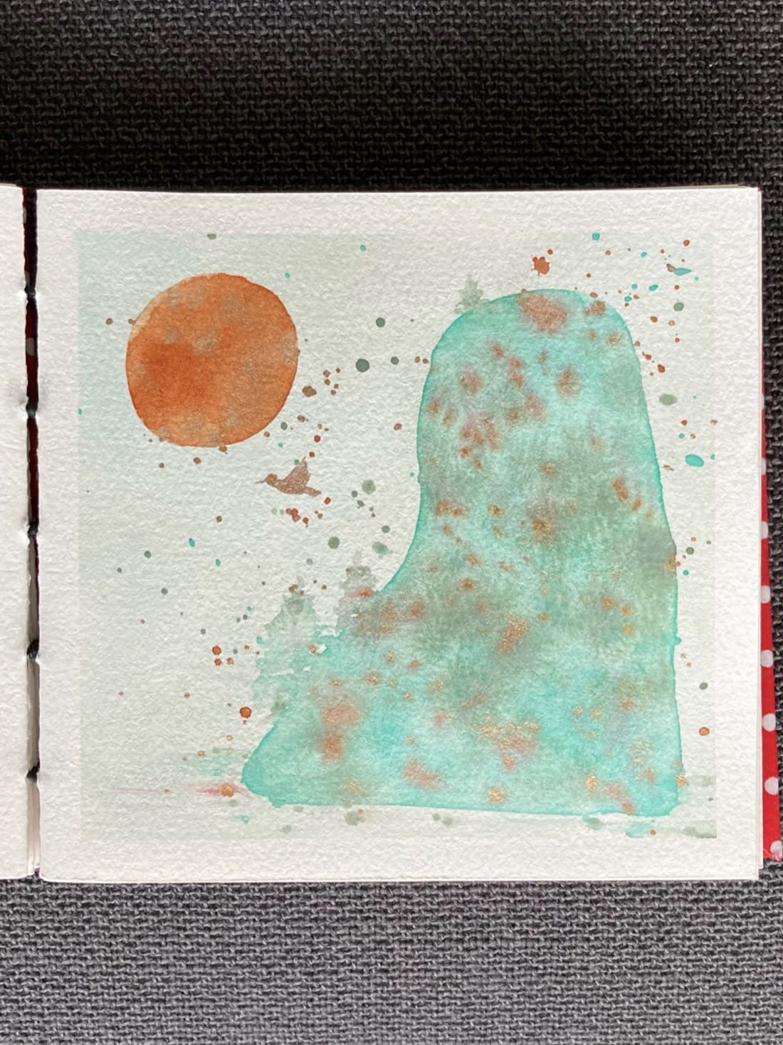 An abstract watercolour painting. A large blobby hill slumps on the right side of the page. It’s teal with orange and green blotches. Out of its left side, a couple of trees are growing. Another tiny tree grows out of its top. In the sky is a large orange sun. A golden bird flies away from the hill towards the sun. Around the hill are splatters of orange, green, and teal. Near the bottom of the hill, the splatters are smudged horizontally as if they were waves in water.