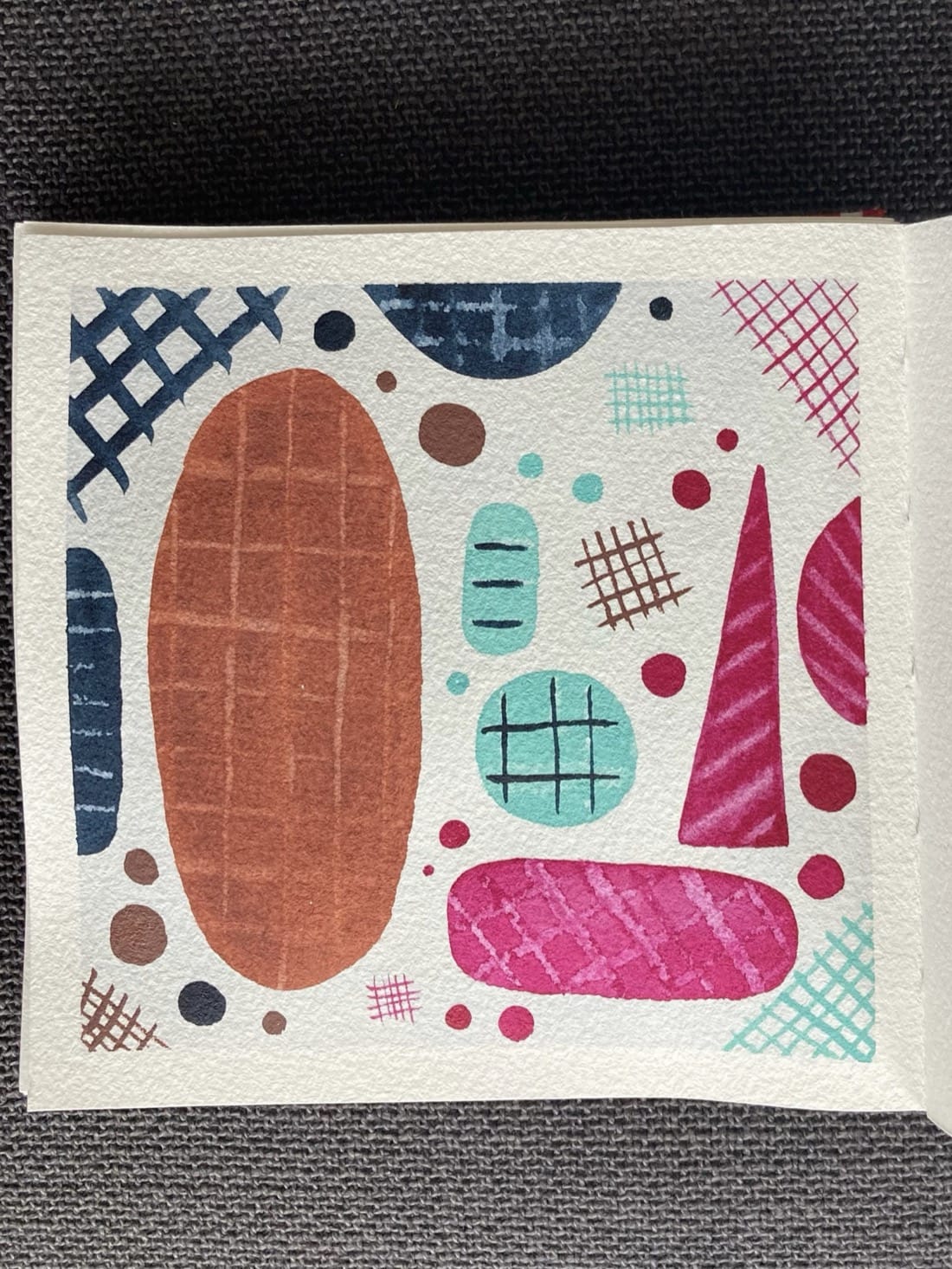 An abstract watercolour painting. A variety of shapes in reddish-brown, turquoise, magenta, and indigo are scattered around the page. The larger shapes have light grid marking or stripes. The smaller shapes, all circles, are solid. In the corners and floating freely in a few places are grids in magenta, indigo, turquoise, and reddish-brown.