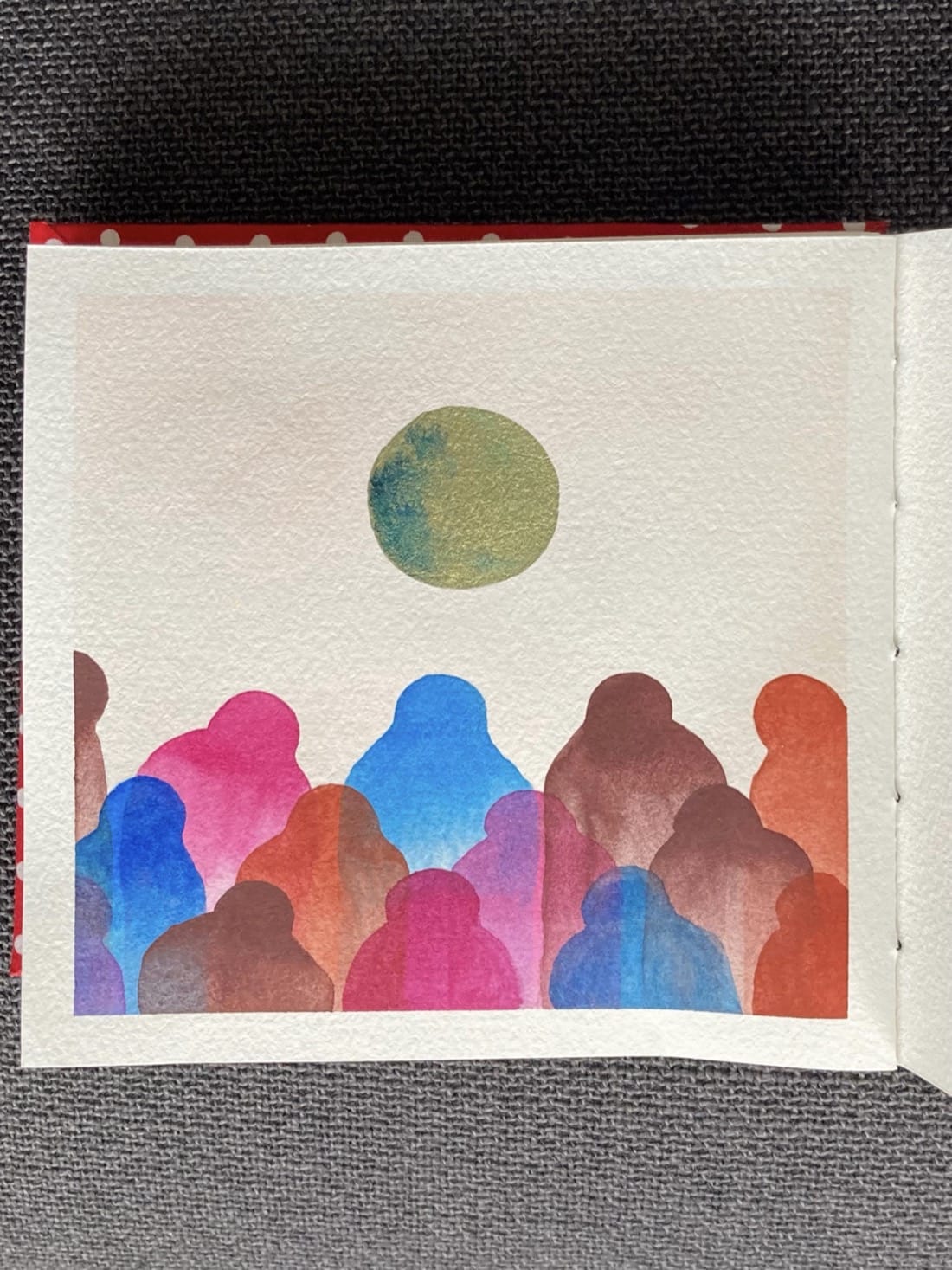 An abstract watercolour painting. A group of translucent people in blue, magenta, deep violet-brown, and reddish-brown robes huddle under a shiny golden green orb.