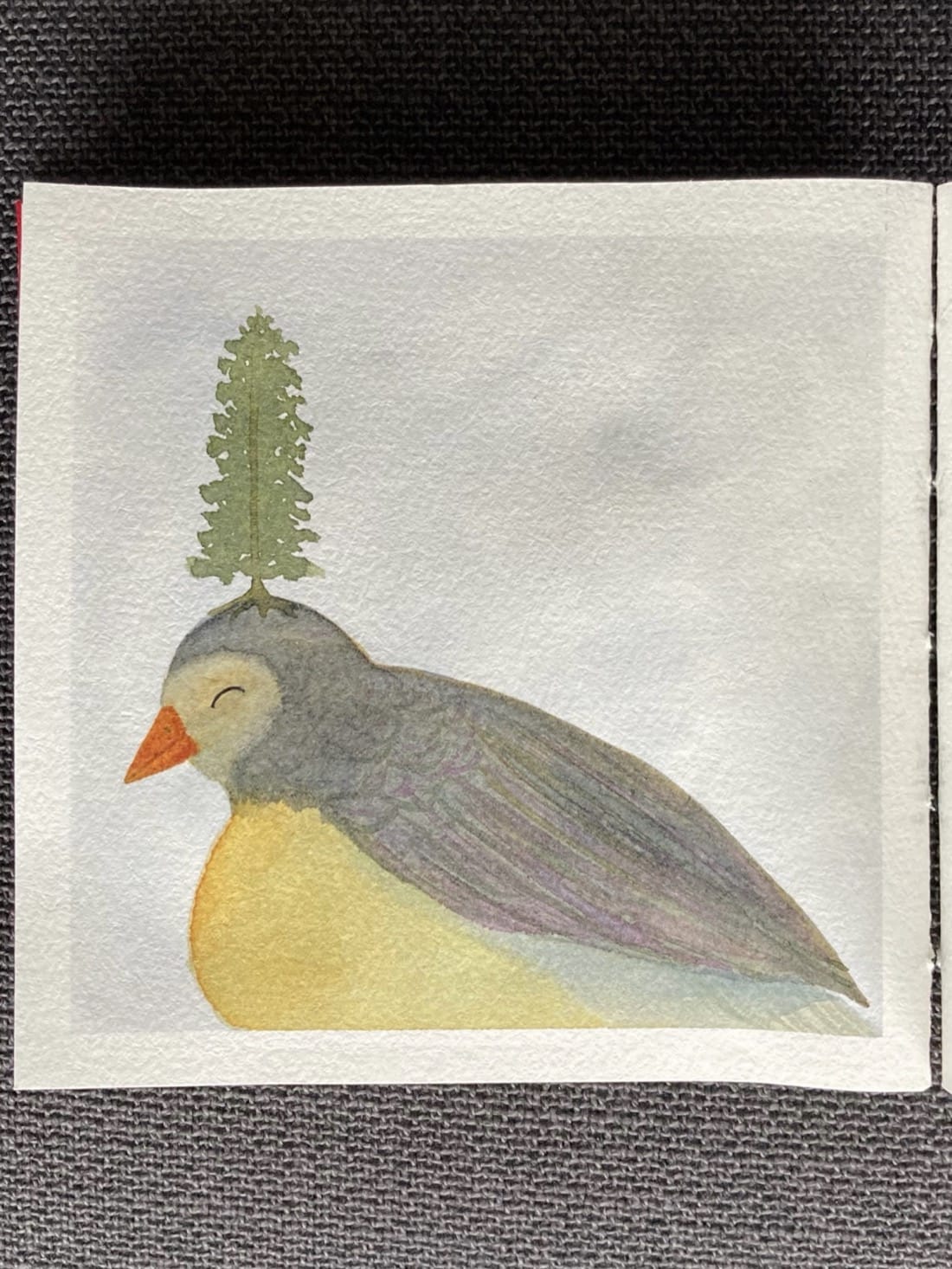 An abstract watercolour painting. A fir tree perches on the head of a large yellow-breasted bird with black wings and an orange beak. The bird’s face is light grey and its expression is one of contentment or sleepiness or maybe a bit of both.