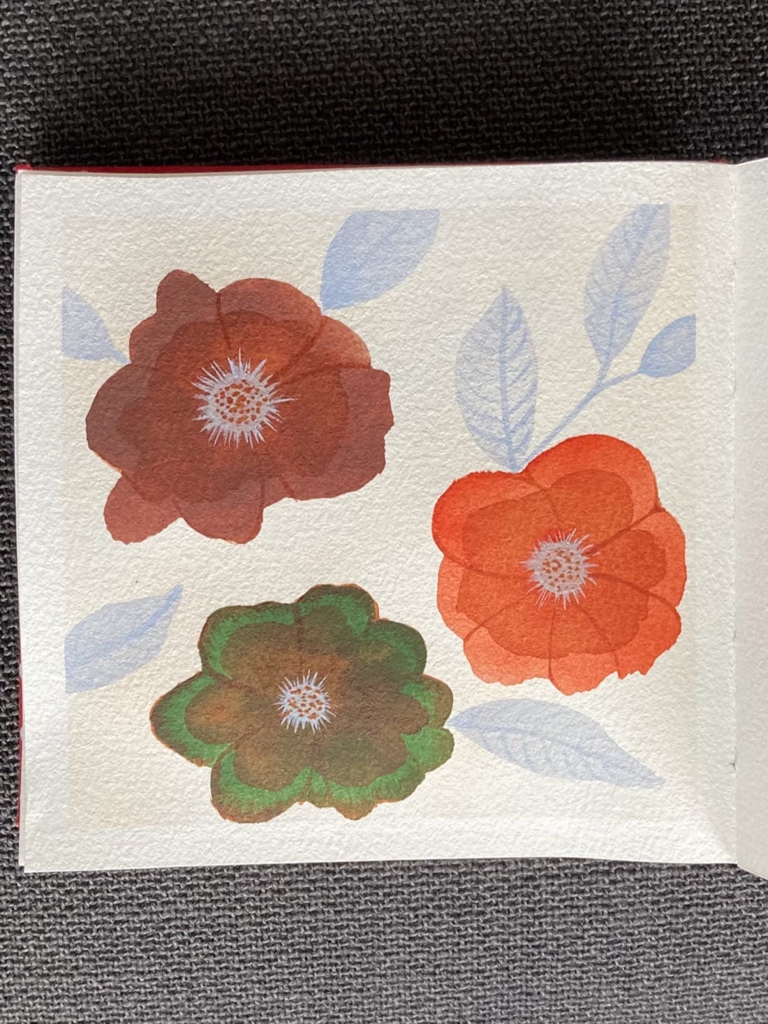 An abstract watercolour painting. Three large blobby flowers take up much of the painting. Top left flower is deep reddish brown with slightly brighter centre petals. The middle bottom flower is emerald green with brown edges and brown centre petals. The middle right flower is bright orang with darker reddish-brown centre petals. Each flower has a pale blue centre dotted with orange. Around the flowers are pale blue leaves on a creamy background.