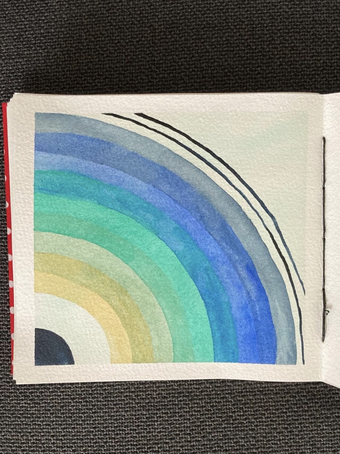 An abstract watercolour painting. In the bottom left corner is a quarter circle of very dark blue. A little above it is part of an arch made up of layers of yellow, green, teal, blue, and indigo. Each colour is partially layered over the next, creating new colours where they overlap. Outside the arch’s edge are two thin dark blue lines. The background is pale mottled teal.