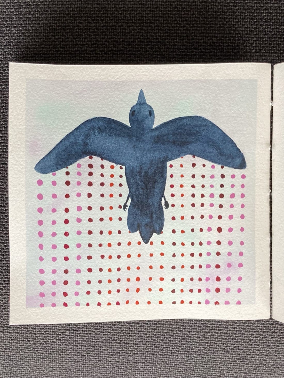 An abstract watercolour painting. A large dark blue bird flies straight up through a pale pink & teal sky. Trailing behind it are rows of small dots in pink, violet, and red.