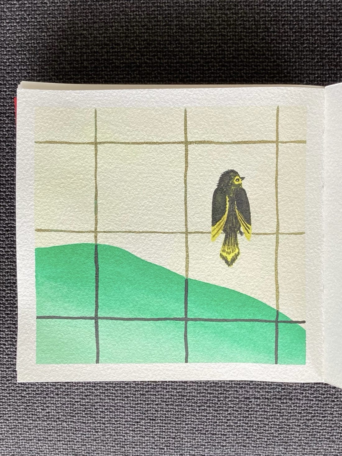 An abstract watercolour painting. A black songbird with yellow feathers around it’s eye and yellow stripes on its wings and tail is perched within one square of a green-gold wire grid. Its back is to the viewer and its head is turned to the right. In the distance is a bright green hill that slopes down to the right. Where the wire grid overlaps the mountain, it is black instead of gold. The sky is mottled pale yellow.