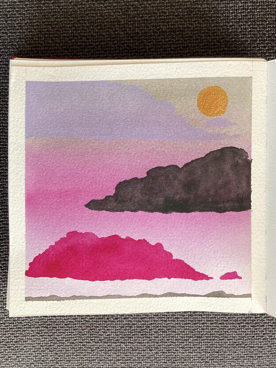 An abstract watercolour painting. A grey to magenta to lilac purple sky looms large above a thin range of dark grey mountains. Over the grey part of the sky is a large lilac cloud, over the magenta area is a large black cloud, and over the lilac section of sky is a magenta cloud. In the top right is the metallic gold circle of the sun.