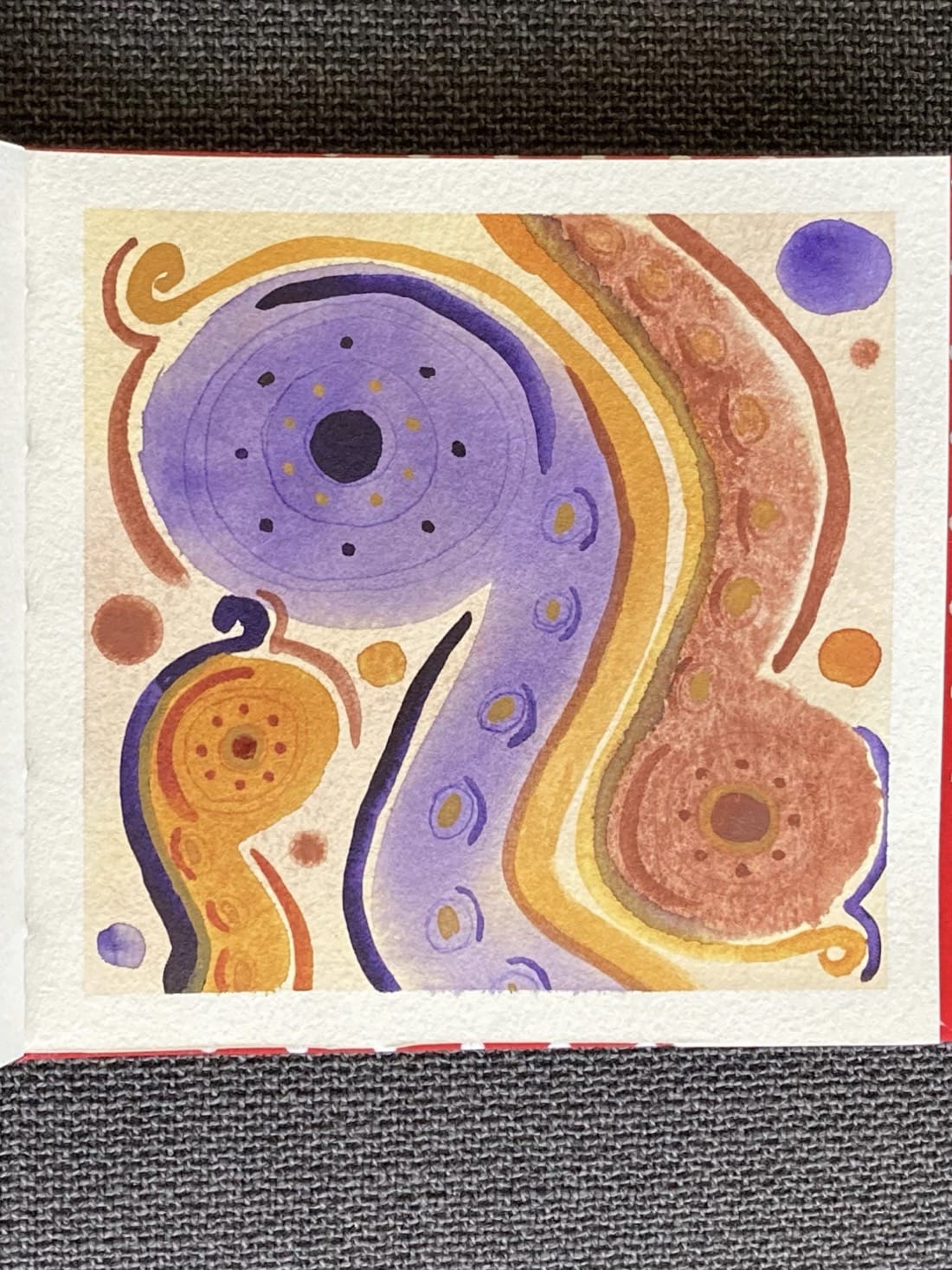 An abstract watercolour painting. A large abstract pale purple snake rises up from the bottom of the page. Its large round head is facing to the left. In the middle of its head is a dark purple eye surrounded by thin concentric rings of dark purple. Between those rings are dots of deep yellow and purple. Along the snake’s neck are dark purple oval outlines, each with a dark yellow streak and a thick dark purple wrapping around its right side. Along the back of the snake is a stripe of dark yellow. The stripe goes up to the top of its head at which point it curls up. There is a second similar but smaller reddish-brown snake descending from the top right, and an even smaller golden orange snake emerging from the bottom left. Around all of them are several circular blobs in purple, orange, yellow, and reddish brown.
