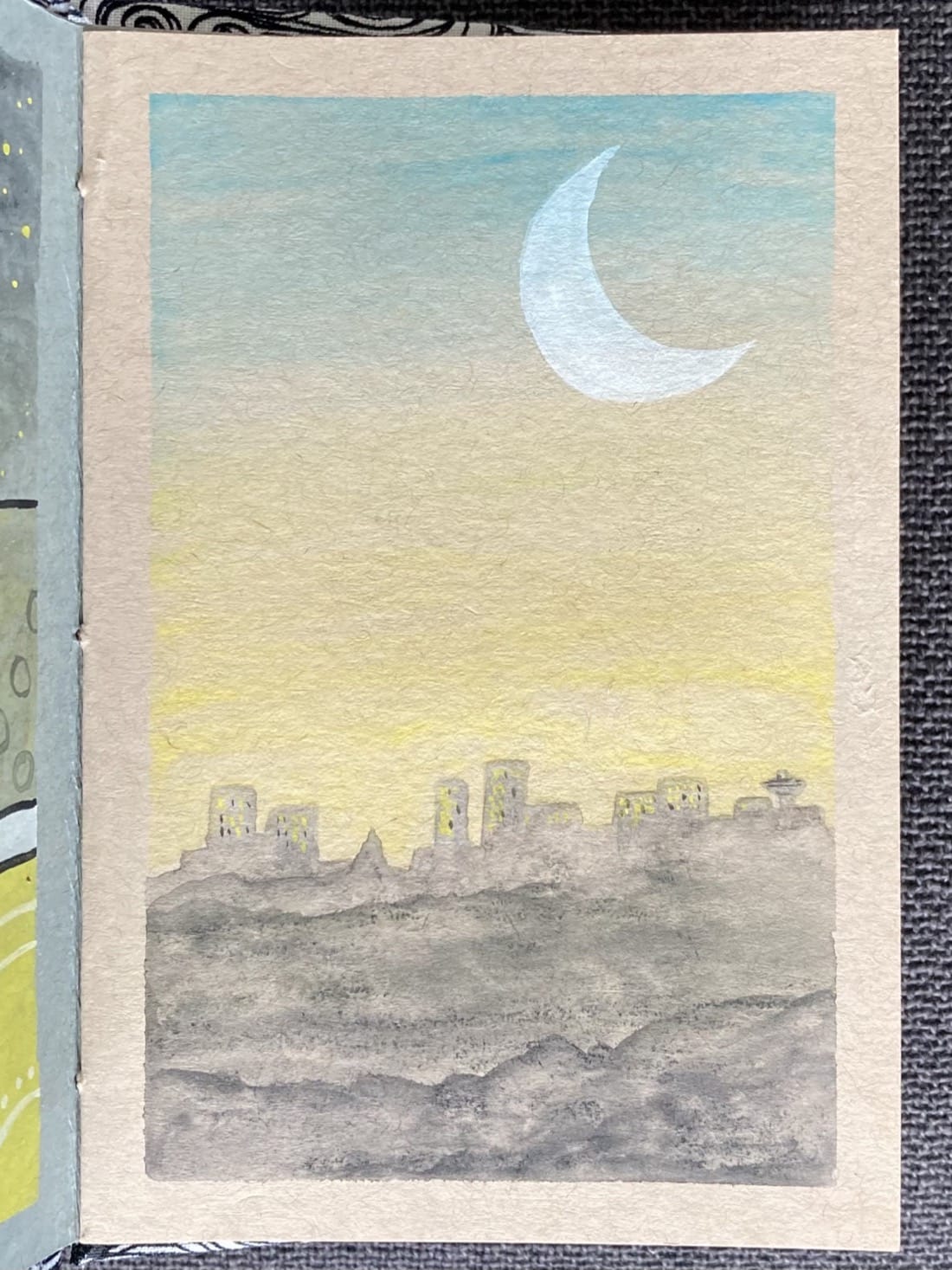 A painting made with Neocolor II water-soluble pastels. Under a large white crescent moon sits the silhouette of a distant city beyond forested hills. Some of the windows in the skyscrapers are lit up. The sky is yellow near the horizon, turning blue near the top of the painting.
