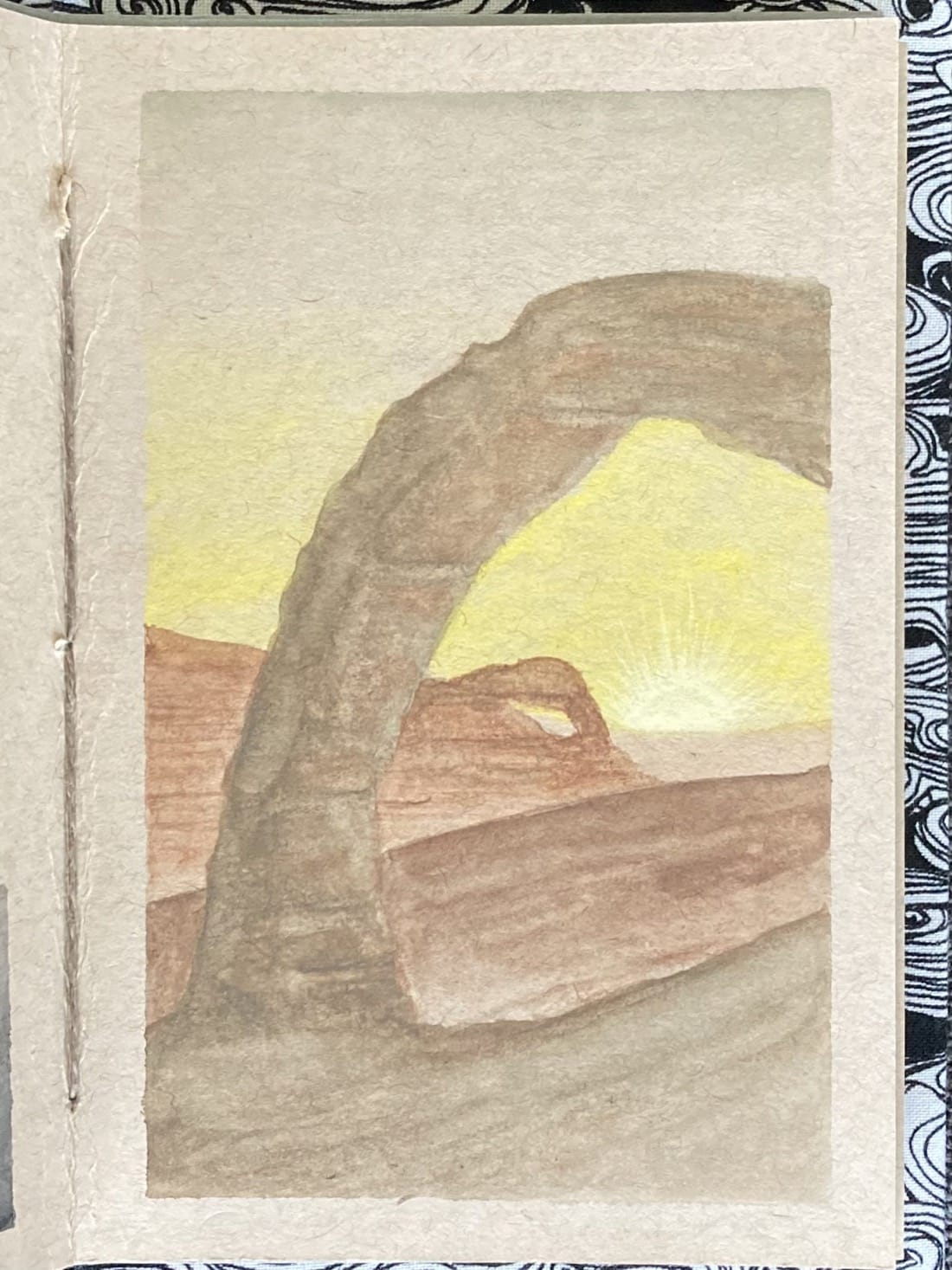 A painting made with Neocolor II water-soluble pastels. A desert scene. The sun is visible at the horizon under a large sandstone arch. A second, smaller arch sits just to the left of the sun, arcing off of a large mesa. The sun is casting bright rays into the yellow sky. Near the top of the painting the sky fades to a dusty grey.