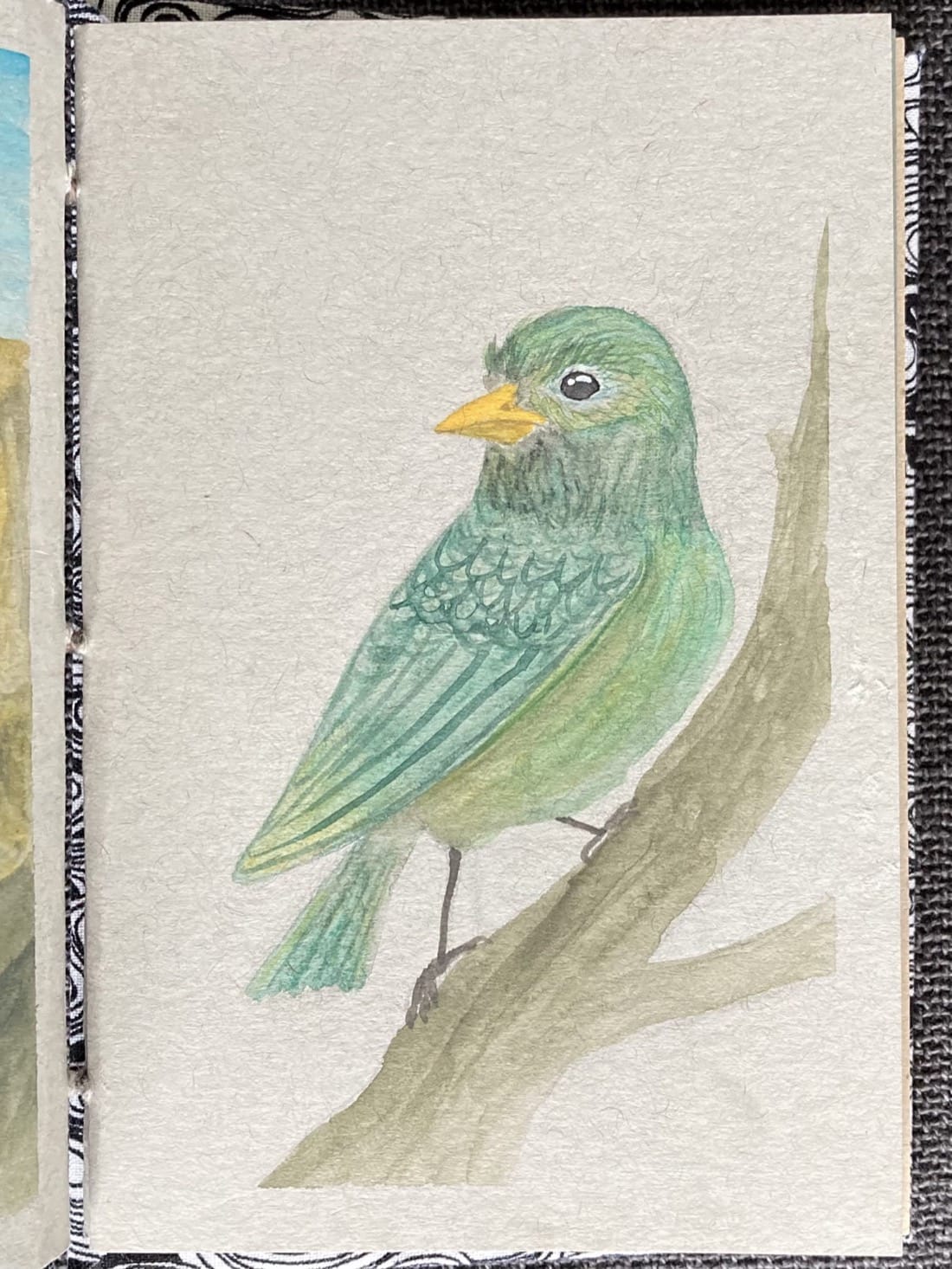 A painting made with Neocolor II water-soluble pastels. A green bird with an orange beak look back over its shoulder while standing on a tree branch.