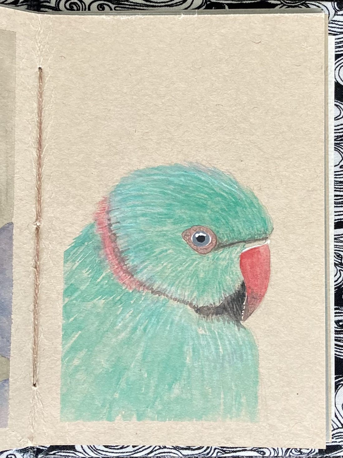 A painting made with Neocolor II water-soluble pastels. A portrait of a green parrot with a red beak and red ring of feathers around its neck on brown mixed media paper.